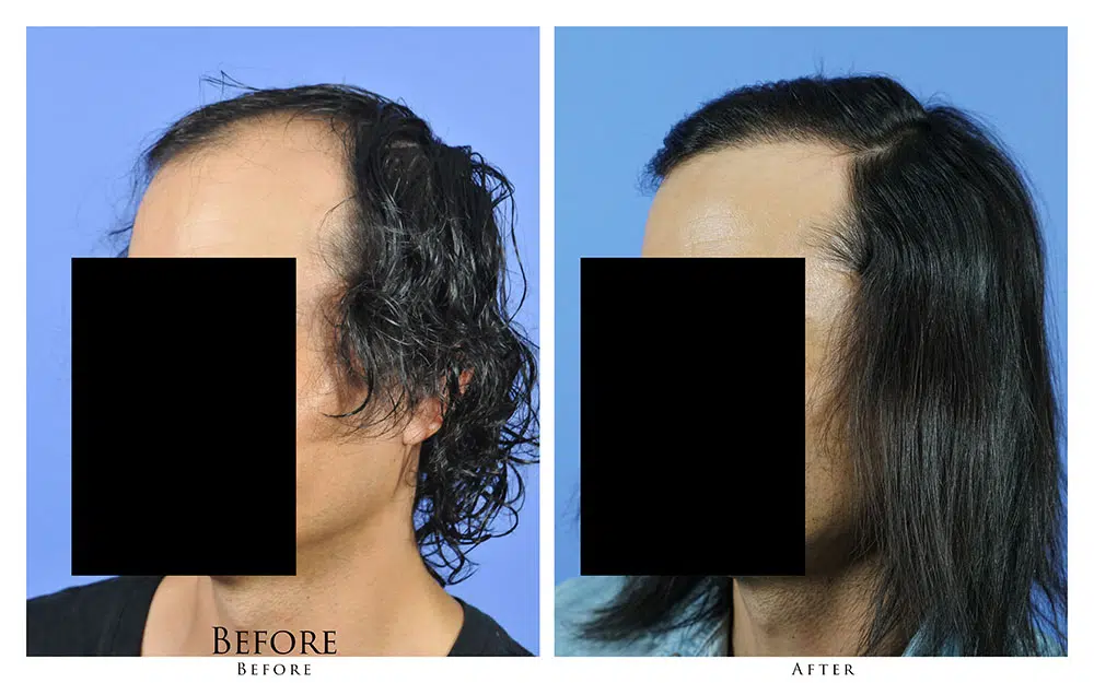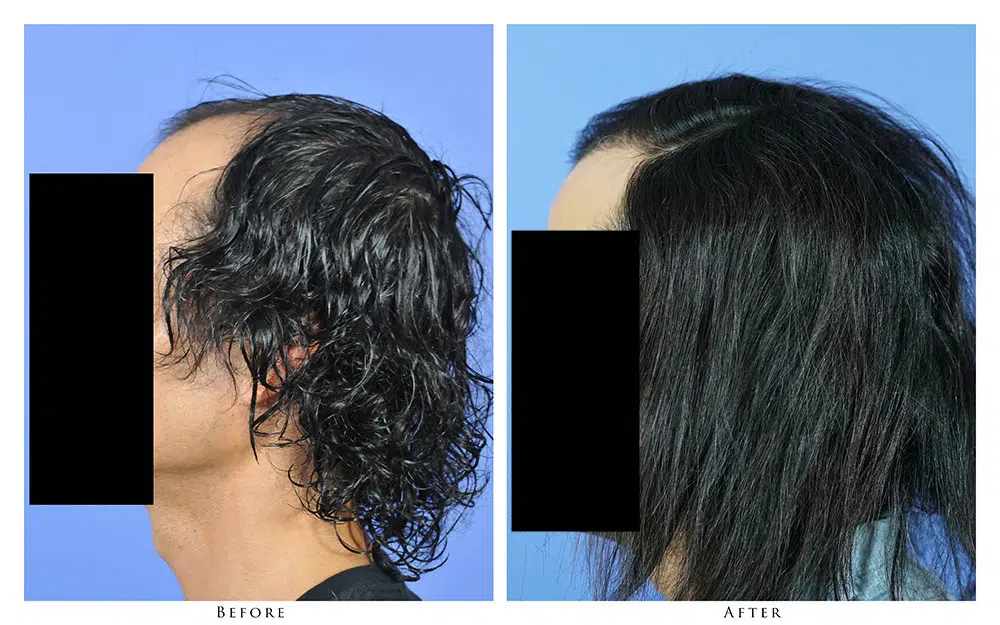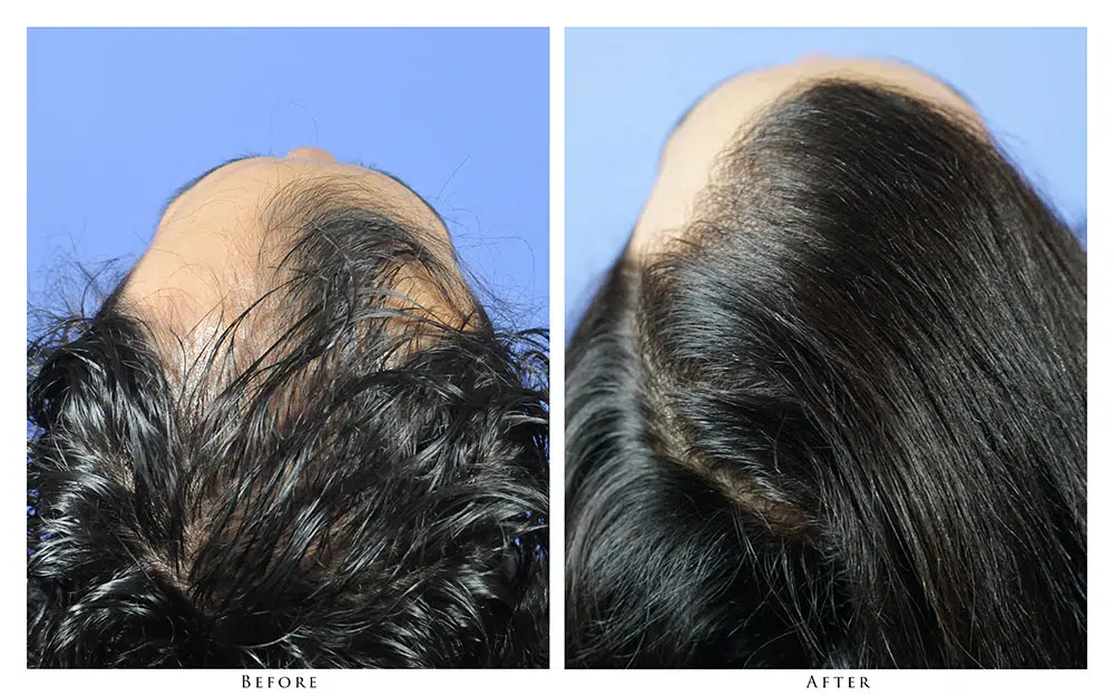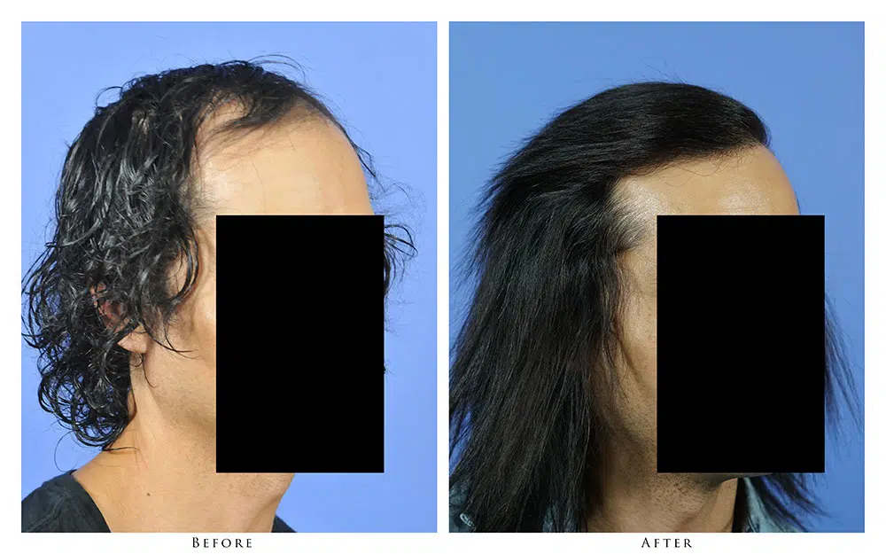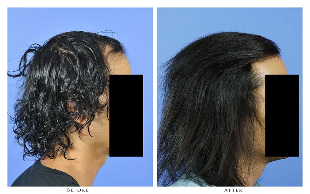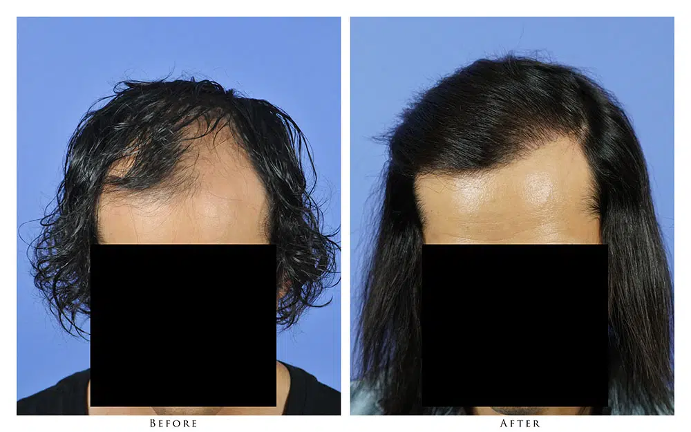 The patient is a 43-year-old male who desired to recreate his frontal hairline. After consultation with Dr. Gabel, he opted to have a hair transplant via the strip harvest method in order to get the maximum density and coverage for the area. Dr. Gabel transplanted 2,652 follicular unit grafts into the frontal zone of the patient’s recipient area in one session. The linear scar in the donor area is barely visible, and is completely covered by the patient’s own hair. The before and after photographs demonstrate the results after 2 years. The patient is extremely happy with the outcome and stated that he wished he hadn’t waited so long to address his male pattern loss.
